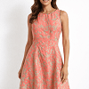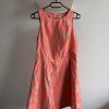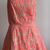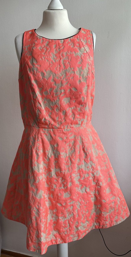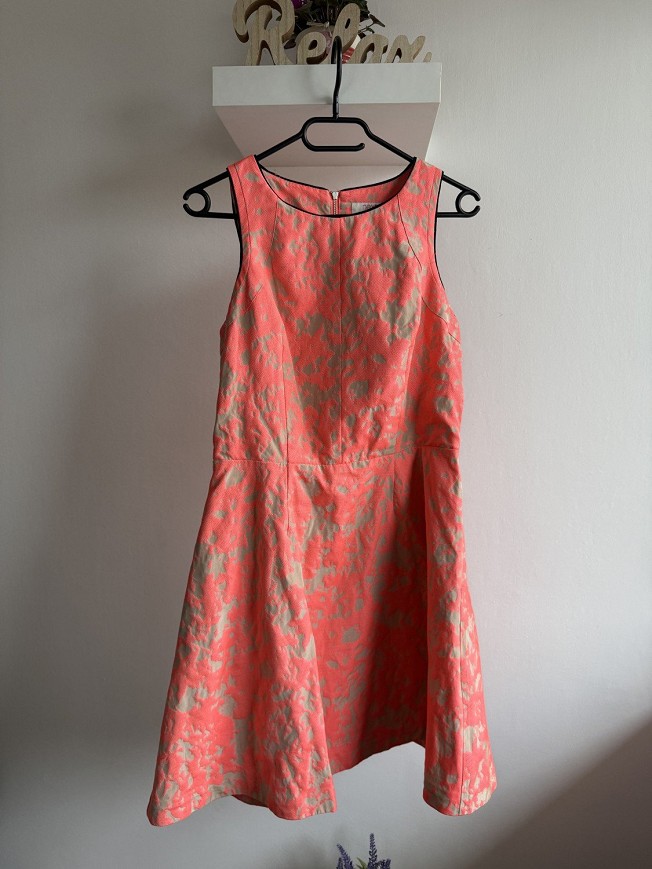 Ujjatlan, A-vonalú ruha gyönyörű korall–barack árnyalatban, arany mintás anyaggal. Karcsúsított felsőrész, hátul cipzáras megoldással, alul enyhén bővülő fazonnal, ami szépen követi az alakot. Tökéletes alkalmakra, vacsorára, eseményekre.
