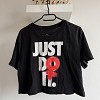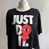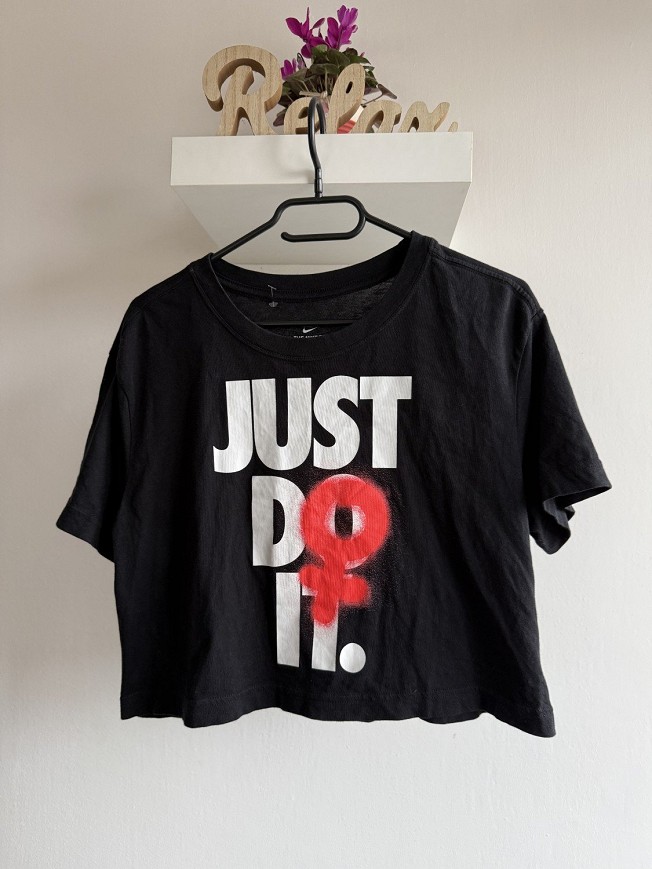 Fekete színű, rövid fazonú Nike póló feltűnő JUST DO IT. felirattal és piros grafikai mintával. Laza szabású, sportos hangulatú darab, puha pamag anyagból. Tökéletes választás edzéshez vagy hétköznapi viseletre, magas derekú farmerrel vagy leggingsszel jól kombinálható.