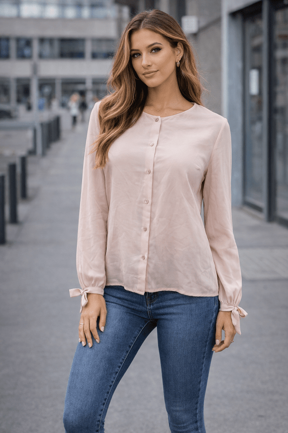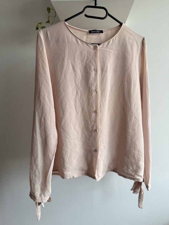 Letisztult, elegáns fazonú blúz finom nude árnyalatban. Gombos kialakítás, hosszú ujjak végén megkötős részlettel, ami különleges és nőies megjelenést ad. Könnyű, lágy esésű anyag, tökéletes akár hétköznapra, akár alkalomra.