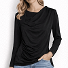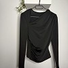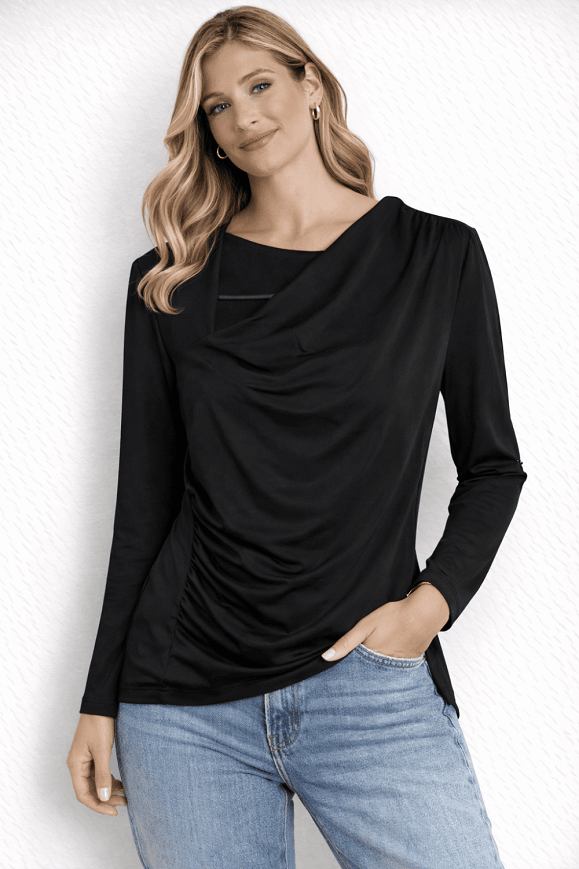 Elegáns, nőies fazonú fekete felső különleges, aszimmetrikus nyakkivágással és enyhén húzott résszel.