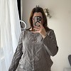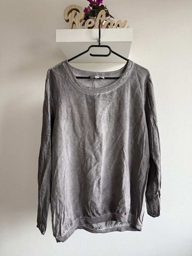 Finom, szürke árnyalatú, puha esésű felső, nyakkivágásnál diszkrét csillogó díszítéssel, ami feldobja az összhatást, mégis elegáns marad.