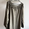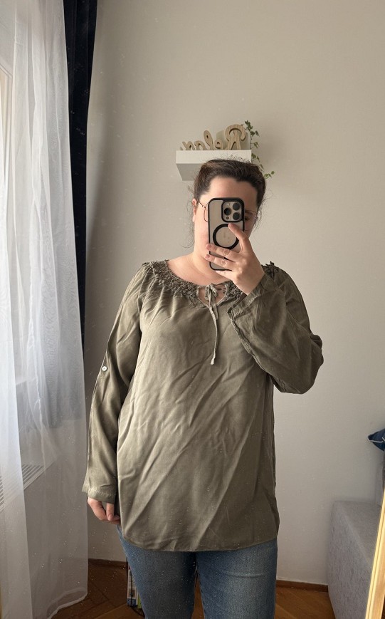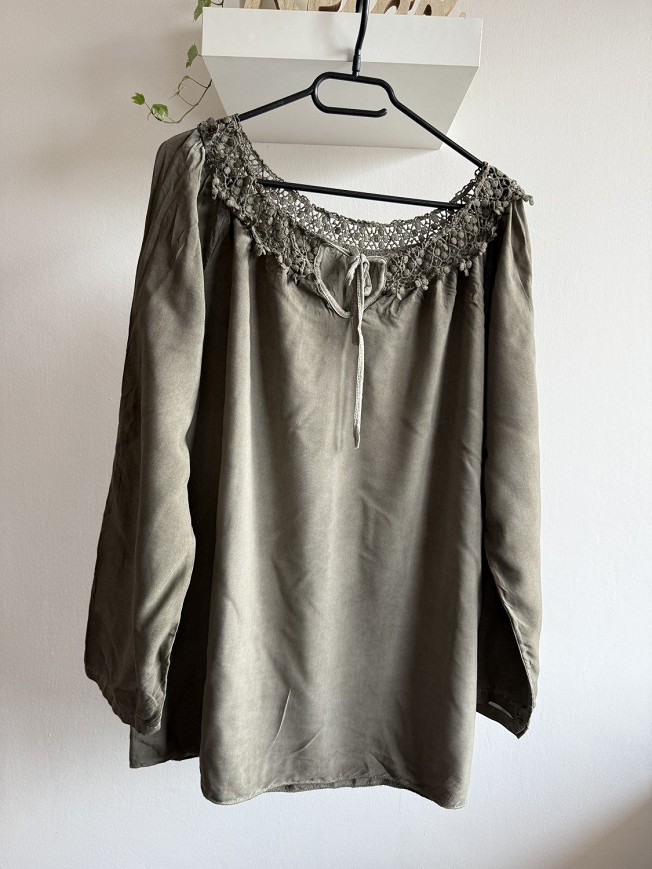 Olívazöld, lágy esésű női felső romantikus csipkedíszítéssel a nyakkivágásnál. Hosszú ujjú, enyhén bő fazonú darab, megkötős részlettel, ami nőies és elegáns megjelenést ad. Farmerrel és elegáns nadrággal is szépen kombinálható, tökéletes választás hétköznapokra vagy alkalomra is.