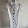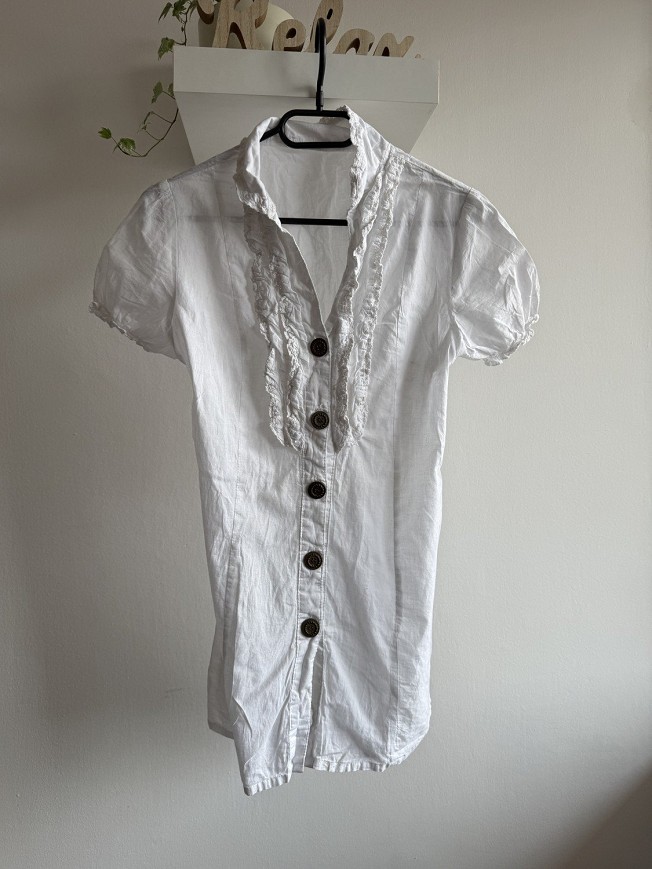 Fehér, rövid ujjú női blúz romantikus fodros díszítéssel és dekoratív gombokkal az elején. Karcsúsított fazonú darab, amely elegáns és nőies megjelenést ad, akár nadrággal, akár szoknyával kombinálva. Egy-két helyen enyhén besárgult, fehérítést igényel, ennek megfelelően kedvező áron elvihető.