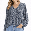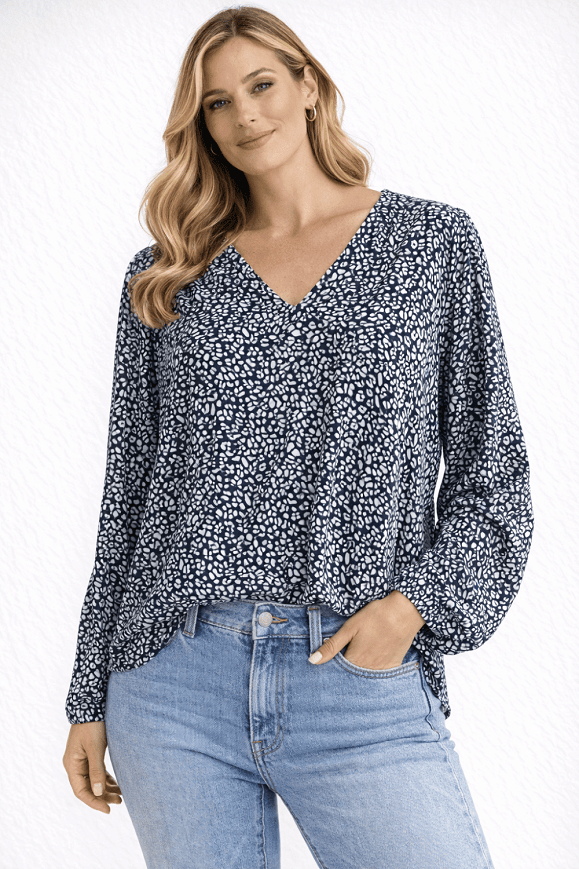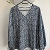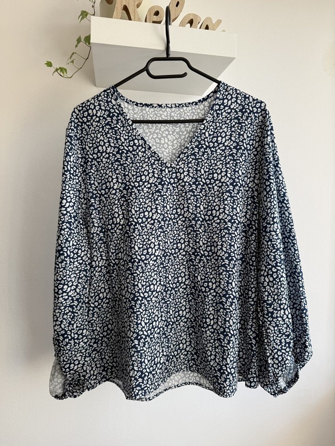 Könnyed, lenge anyagú darab apró mintával és hosszú ujjakkal. Nőies, kényelmes viselet, amely farmerrel vagy elegánsabb nadrággal is jól kombinálható.