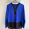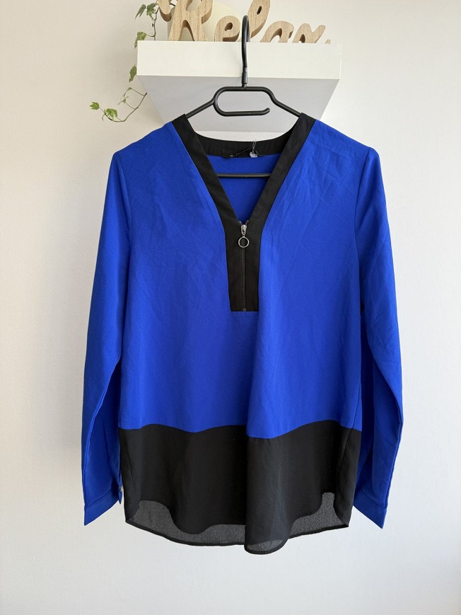Kék-fekete elegáns blúz cipzáras kialakítással.