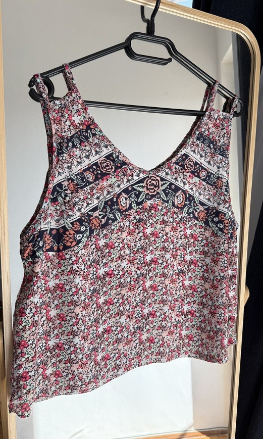 Virágmintás, vékony pántos felső V-nyakú kialakítással. Könnyű, légies anyagú, laza esésű darab, ami kényelmes viselet a melegebb napokon. Farmerrel, shorttal vagy szoknyával is jól kombinálható nyári felső.