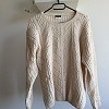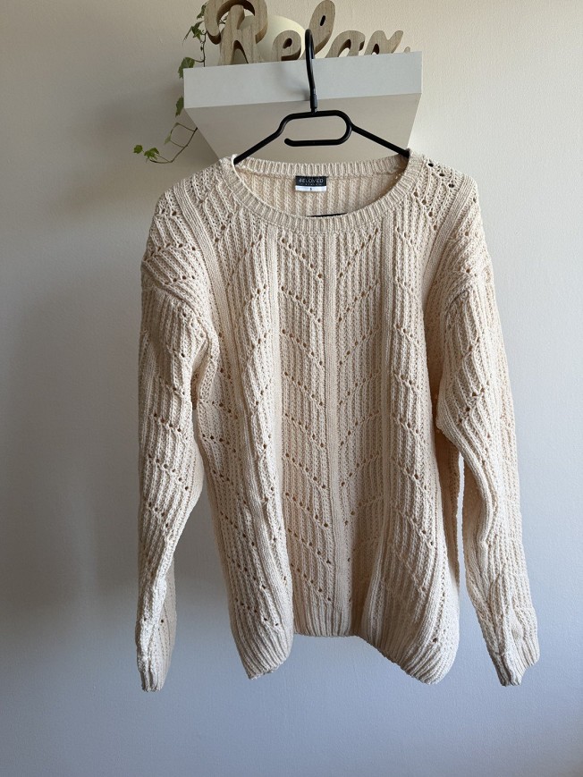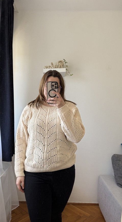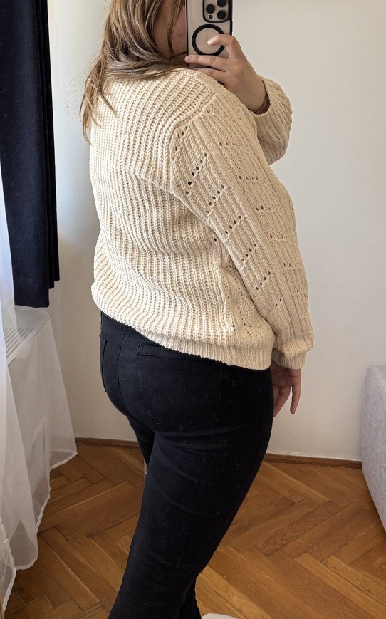 Krém színű, vastag kötött női pulóver különleges, fonott mintázattal. Meleg, puha tapintású darab, amely tökéletes választás a hűvösebb napokra. Klasszikus, mégis nőies fazon, amely farmerrel és csizmával is nagyon jól mutat. A részletgazdag kötés igazán hangulatossá és stílusossá teszi. Használt, szép állapotú, időtálló alapdarab a gardróbba.