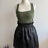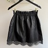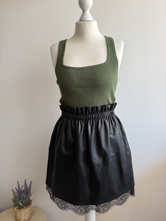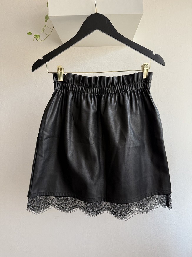 Fekete műbőr mini szoknya rugalmas, gumírozott derékrésszel. Az alját elegáns csipkedíszítés teszi különlegessé és nőiessé. Csinos darab, amely tökéletes felsőkkel és csizmával is.