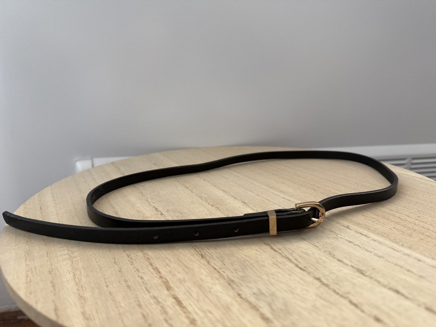 Fekete, keskeny női öv arany színű csattal. Letisztult, elegáns darab, amely ruhához és nadrághoz is jól kombinálható. Megkímélt állapotú, praktikus alap kiegészítő.