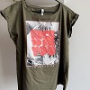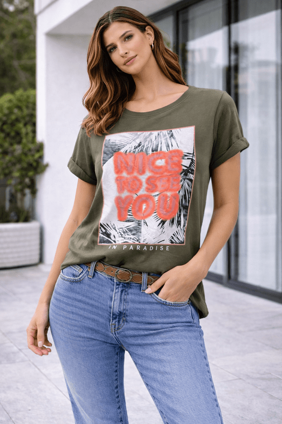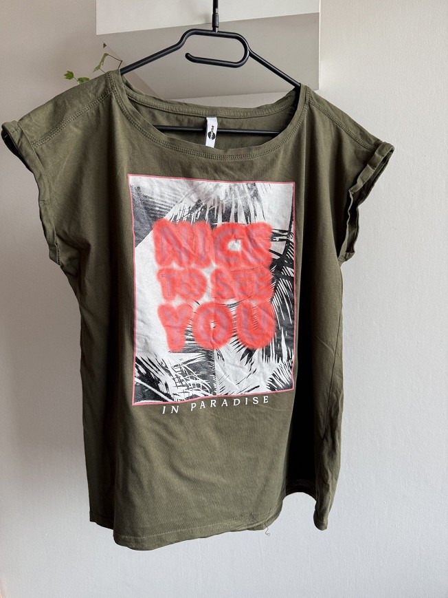 Zöld színű, feliratos női póló vagány, nyári mintával és élénk neon felirattal, amely igazán feldobja az összhatást. Kényelmes, puha anyagú darab, farmerrel vagy shorttal tökéletes hétköznapi választás. Az alsó részen apró varráshiba található (fotózva), ennek megfelelően kedvezőbb áron elérhető.