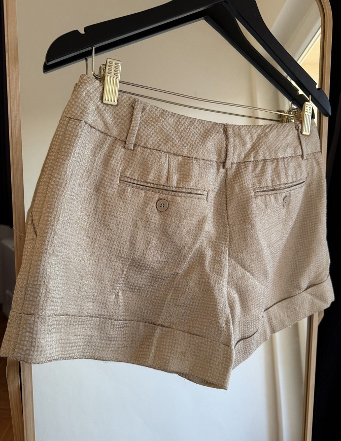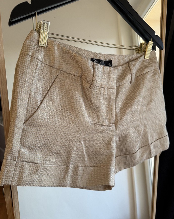 Arany árnyalatú, elegáns hatású short strukturált anyagból. Oldalt zsebekkel, letisztult fazonnal. Csinos darab, ami nyári alkalmakra vagy elegánsabb szettekhez is jól kombinálható.