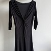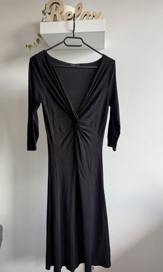 Fekete, elegáns midi ruha. Mély V-kivágású, mellrésznél csavart, ráncolt megoldással, ami szépen formálja az alakot. 3/4-es ujjú, enyhén A-vonalú szabással, kényelmes, rugalmas anyagból. Alkalmi eseményre, vacsorára vagy akár hétköznapi elegáns viseletként is tökéletes választás.