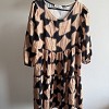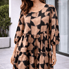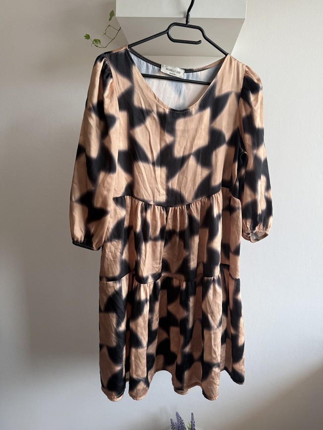 Barna-fekete mintás, nőies fazonú ruha könnyed, lágy esésű anyagból. V-kivágással és enyhén bővülő, réteges szabással készült, amely szépen kiemeli a derekat és kényelmes viseletet biztosít. Tökéletes választás hétköznapokra vagy akár alkalmi megjelenéshez is, egy csinos cipővel kombinálva.