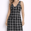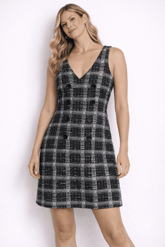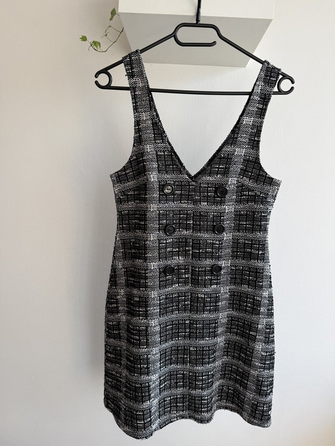 Mintás, gombdíszes ujjatlan ruha.