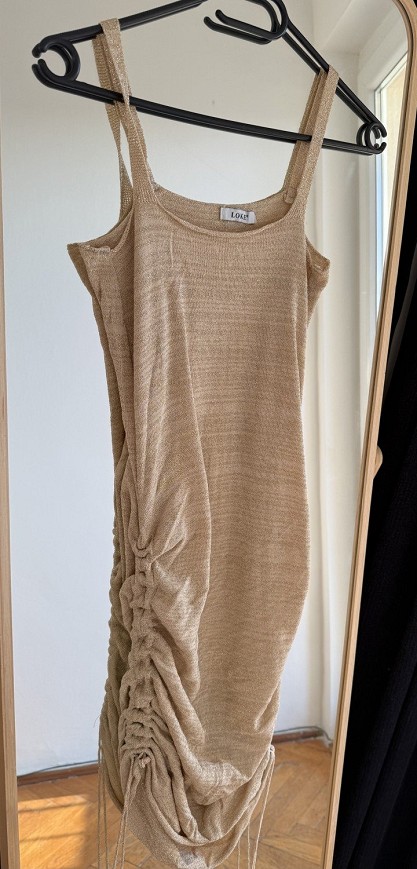 Nőies, bézs színű pántos ruha különleges húzott részlettel az oldalán. A ráncolt kialakítás és az állítható húzózsinór egyedi megjelenést ad, valamint szépen kiemeli az alakot.