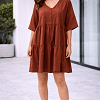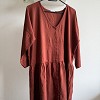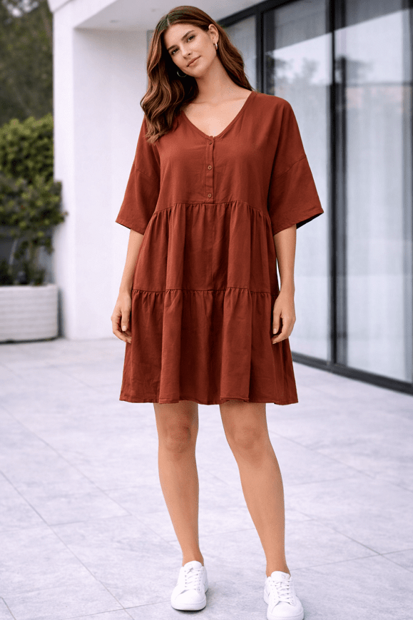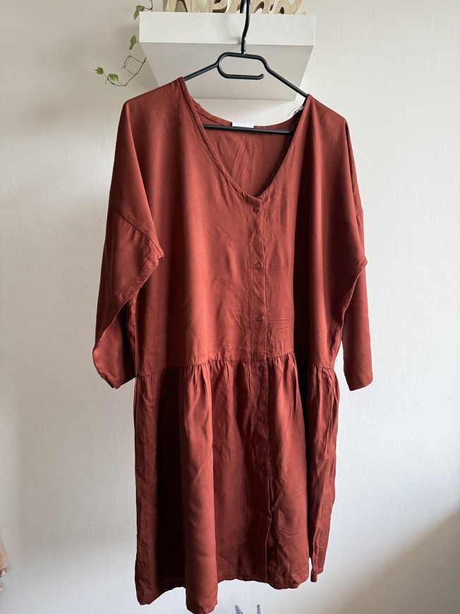 Rozsdabarna árnyalatú, lenge fazonú női ruha V-kivágással és elöl gombos megoldással. Lazán szabott, kényelmes darab, amely szépen esik és nőies megjelenést ad a hétköznapokra is. Csizmával, sneakerrel vagy övvel kombinálva is stílusos választás az átmeneti időszakban.