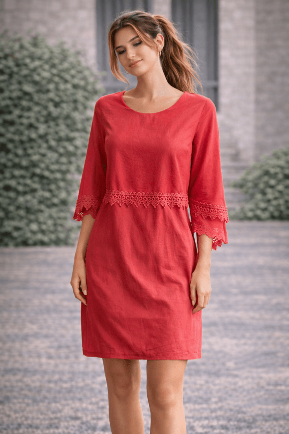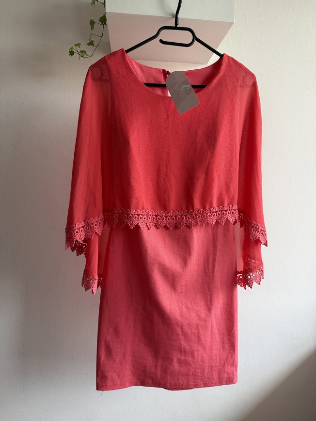 Gyönyörű, élénk színű ruha csipkés részletekkel az ujjaknál és mellrésznél. Nőies, elegáns fazon, ami tökéletes alkalmakra, eseményekre. Új, címkés darab!
