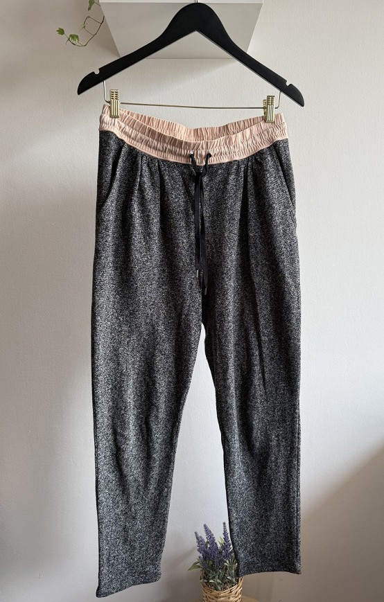 Kényelmes, szürke melírozott nadrág puha tapintású anyagból, amely tökéletes választás a hétköznapokra vagy otthoni viseletre. Gumis dereka és megkötője biztosítja az ideális illeszkedést. Sportos, mégis csinos darab, ami könnyen kombinálható basic felsőkkel.