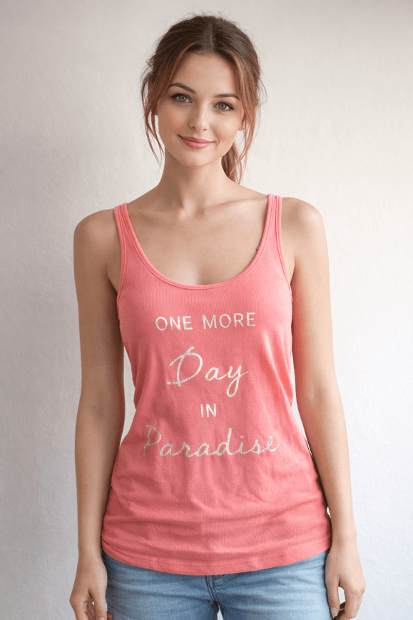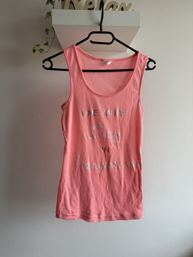 Könnyed, bordázott anyagú trikó, kellemes barackos-rózsaszín árnyalatban. Felirata igazán nyárias hangulatot ad: “One more day in paradise” 🌴 Tökéletes hétköznapokra, nyaraláshoz vagy egy laza szetthez.