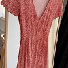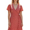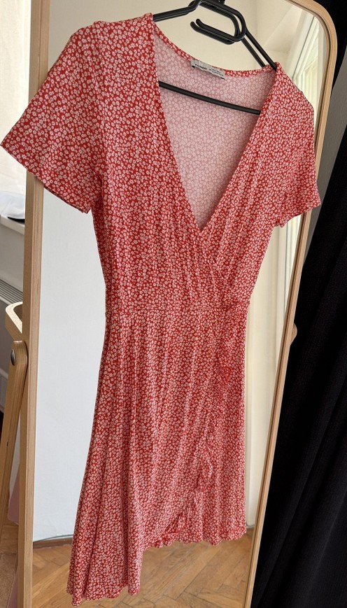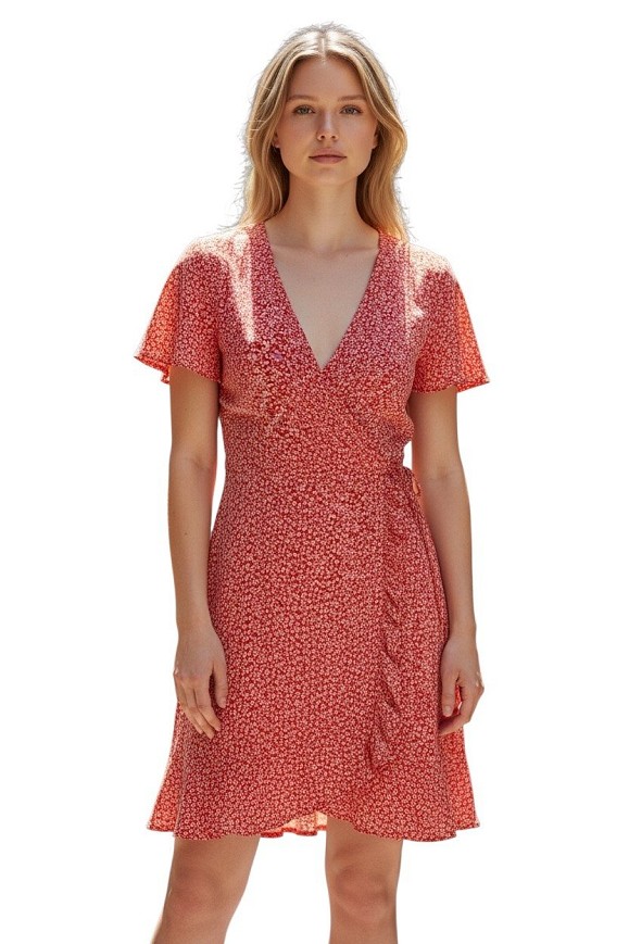 Piros alapon apró virágmintás nőies nyári ruha mélyebb V-kivágással. A derekánál szabott fazon szépen kiemeli az alakot, a szoknyarész pedig könnyed és légies.