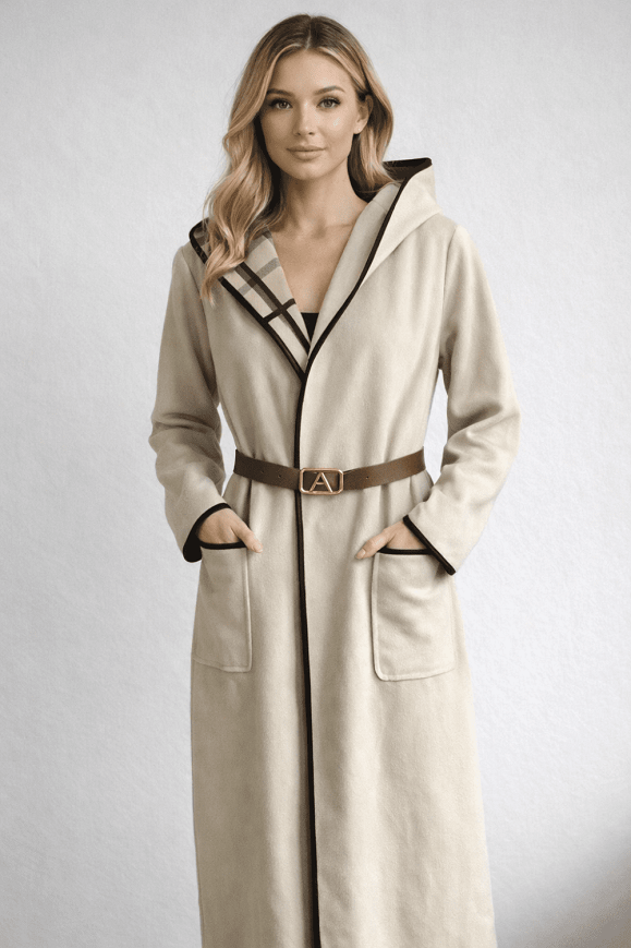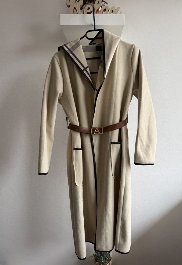 Bézs színű, hosszított fazonú olasz kabát, minőségi anyagból. Derékban öves kialakítású, szépen karcsúsít, belül kockás béléssel. Letisztult, elegáns darab, amely hétköznapi és csinosabb szettekhez is tökéletes választás. Átmeneti időre ideális.