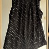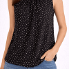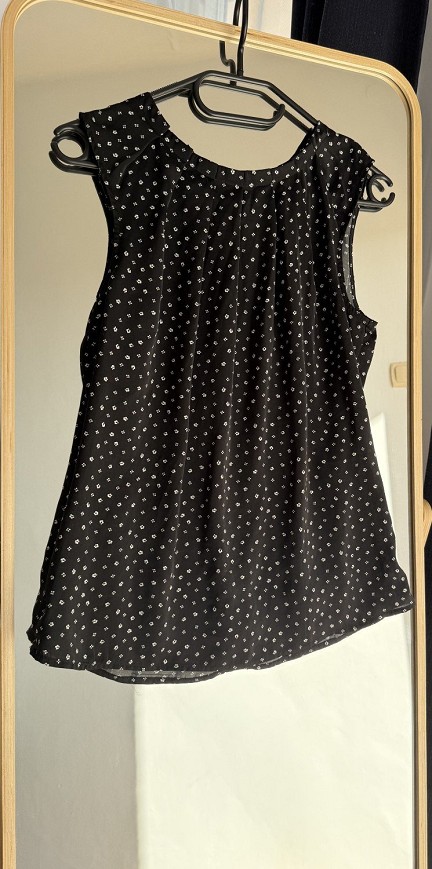 Fekete színű, apró mintás ujjatlan felső. Könnyű, légies anyagú, nyaknál enyhén ráncolt kialakítással. Kényelmes, nőies darab, ami farmerrel vagy elegánsabb nadrággal is jól kombinálható.