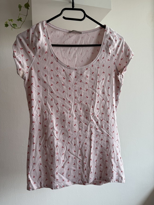 Nőies szabású Orsay felső, apró horgony mintával, ami igazán különlegessé teszi. Világos alapon piros minta, könnyen kombinálható, mégis feldobja az egyszerű szetteket. Kényelmes, rugalmas anyag, testhez simuló fazon.