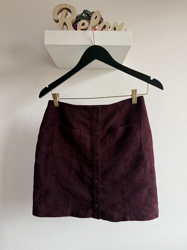 Bordó (burgundi) színű, velúr hatású mini szoknya, elöl végig patentos záródással. Magasított derekú fazon, elején két praktikus zsebbel. Puha tapintású, őszre-télre tökéletes darab, csizmával vagy harisnyával is nagyon csinos.