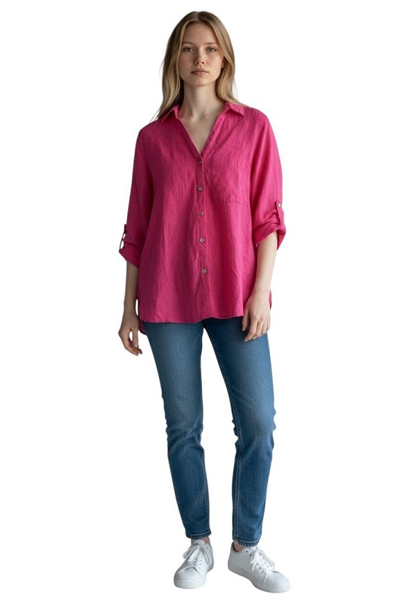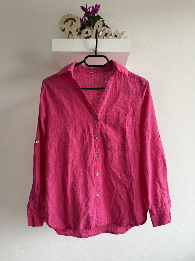 Élénk pink színű, könnyű, lenhatású anyagból készült ing.