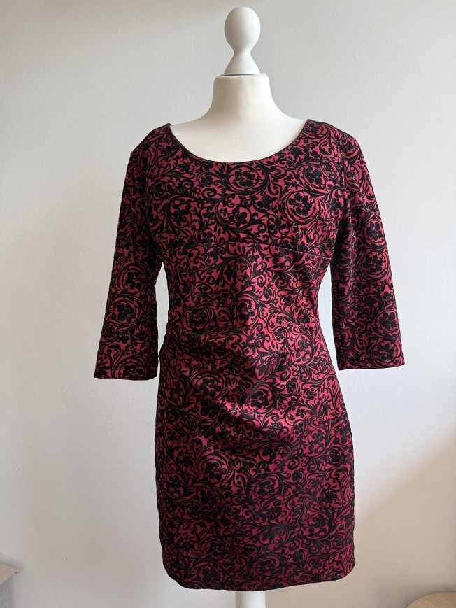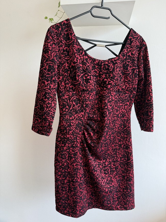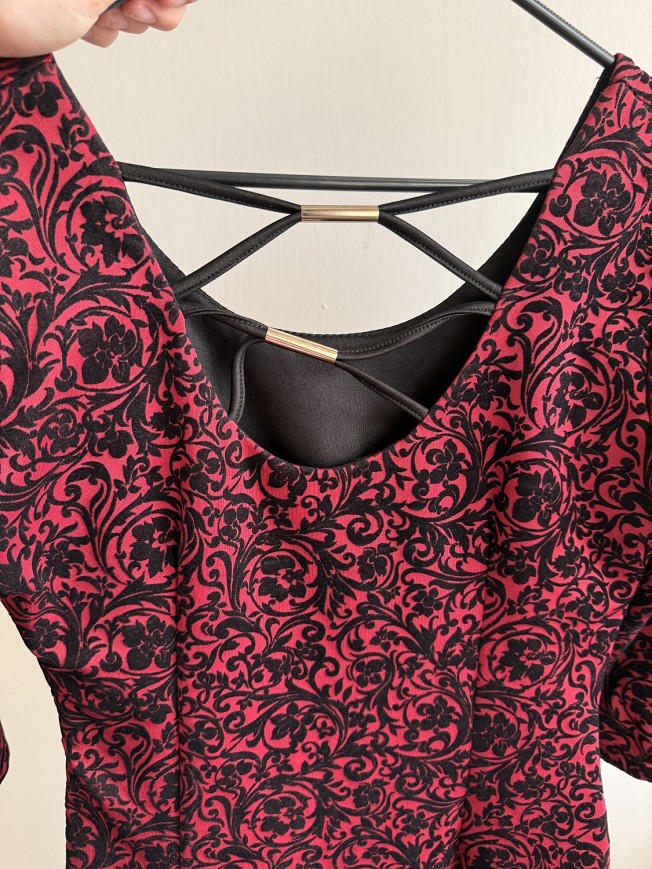 Elegáns, piros-fekete mintás ruha különleges, nőies szabással. A hátán keresztpántos megoldás és aranyszínű díszítés teszi igazán egyedivé. Tökéletes választás alkalmakra, buliba vagy ünnepi eseményre – garantáltan figyelemfelkeltő darab.