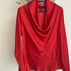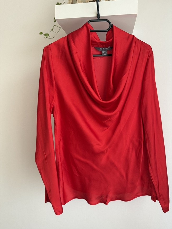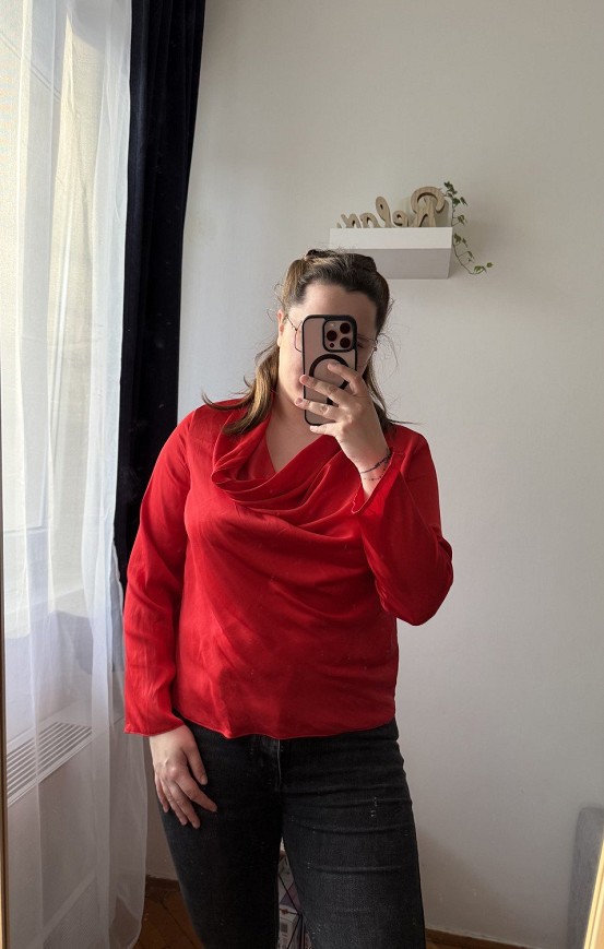 Elegáns, élénk piros felső lágyan omló, vízesés fazonú nyakrésszel. Könnyed anyaga szépen követi a vonalakat, így igazán nőies megjelenést ad. Tökéletes választás alkalmakra vagy egy csinosabb hétköznapi szetthez.