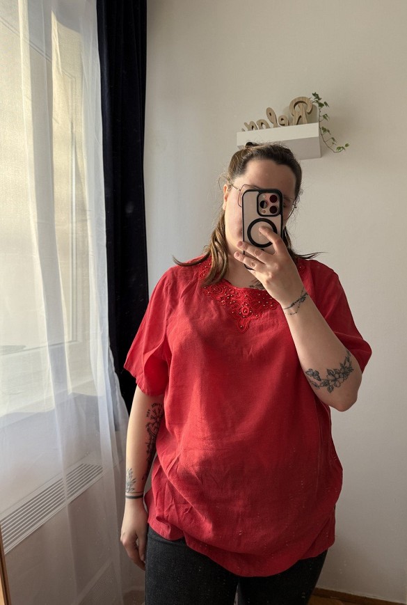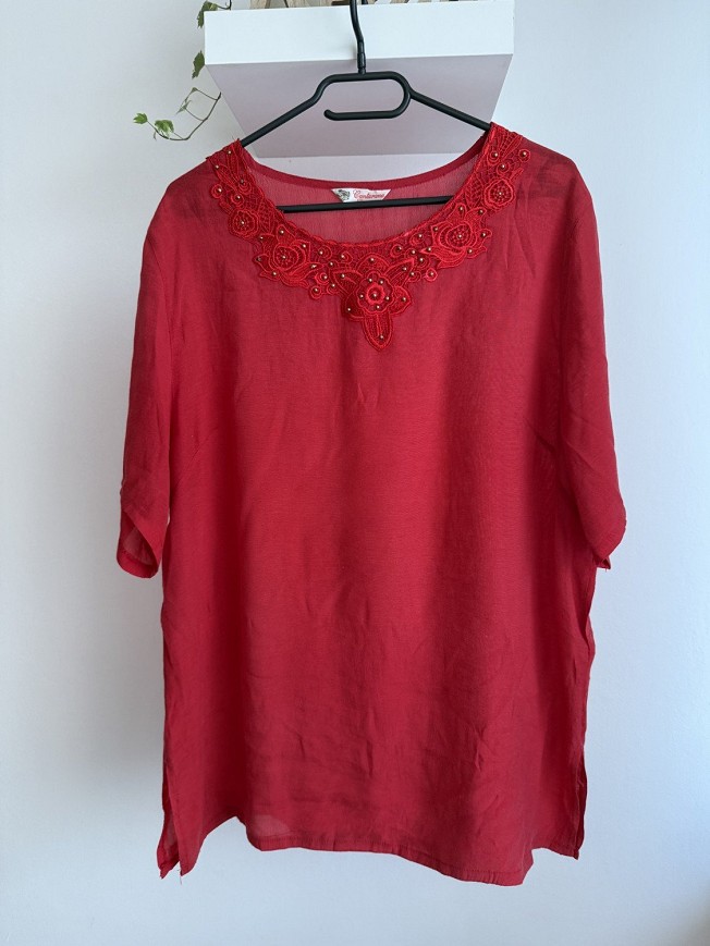 Élénk piros, légies anyagú felső elegáns, gyöngyökkel díszített nyakrésszel. Könnyed esése és laza fazonja kényelmes, mégis nőies megjelenést biztosít. Tökéletes választás, ha egy feltűnő, mégis kifinomult darabra vágysz.