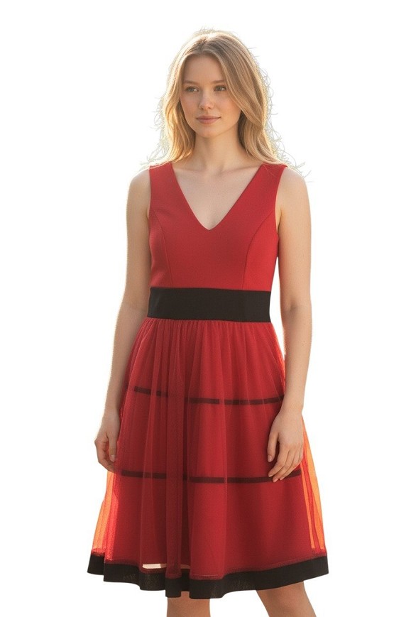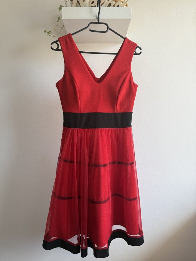 Deréknál fekete betét hangsúlyozza az alakot, alul pedig áttetsző tüllös réteg ad könnyed, nőies esést.