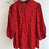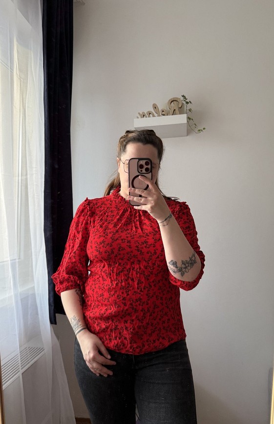 Piros alapon apró fekete virágmintás, romantikus hangulatú felső. Finom fodros részletei és bő szabása igazán nőies megjelenést adnak. Farmerrel és elegánsabb nadrággal is gyönyörű választás.