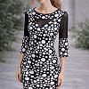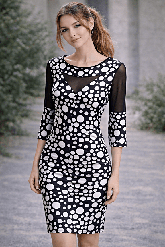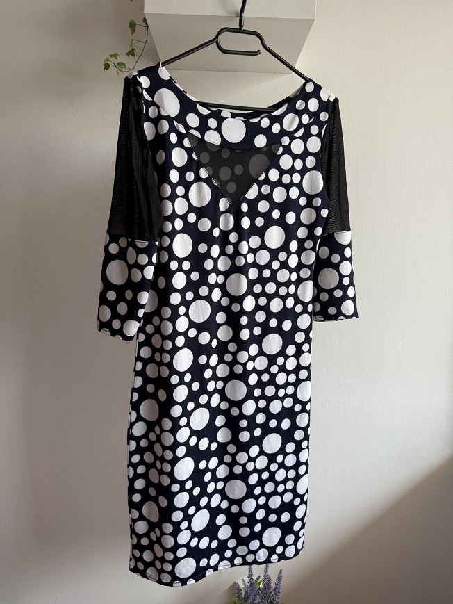 Klasszikus, mégis különleges pöttyös ruha sötét alapon. A felsőrészen áttetsző betét és a hálós ujjrész igazán nőies, elegáns hatást ad. Testhez simuló fazon, ami szépen kiemeli az alakot.