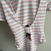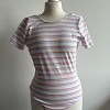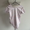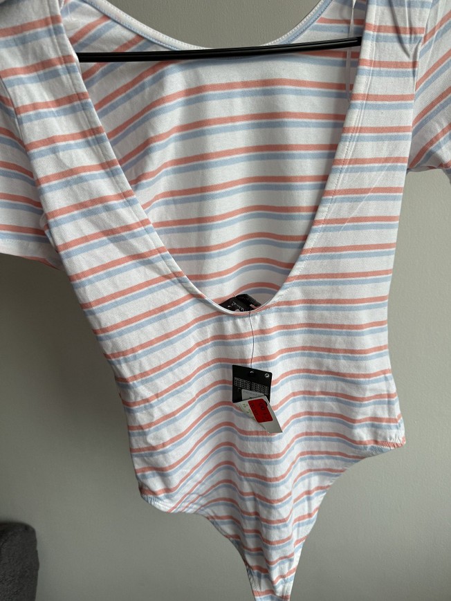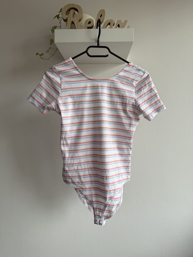 Új, címkés csíkos body. Fehér alapon pasztell rózsaszín és kék csíkos, hátul mélyebb kivágással – nőies, mégis kényelmes darab. Tökéletes farmerhez vagy magas derekú nadrághoz.