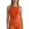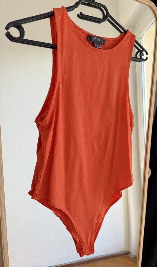 Élénk narancssárga színű, ujjatlan body letisztult fazonnal. Puha, rugalmas anyaga kényelmes viseletet biztosít, miközben szépen követi a test vonalát.