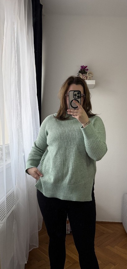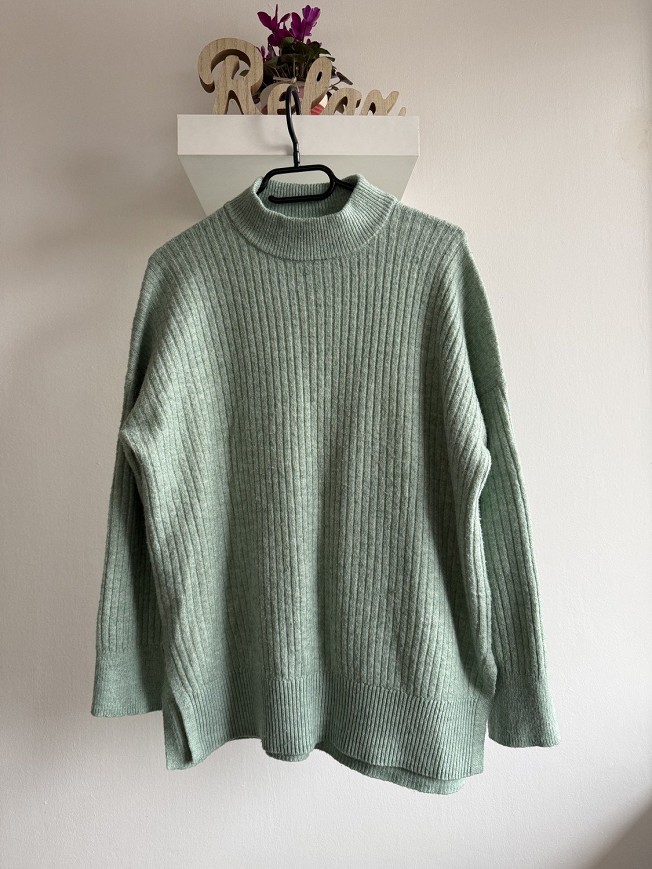 Zöld színű, bordázott anyagú, puha tapintású pulóver kényelmes, laza fazonnal. Magasított nyakkialakítása miatt hűvösebb időben is praktikus választás. Letisztult darab, amely könnyen kombinálható farmerrel, leggingsszel vagy akár szoknyával is, hétköznapi viseletre ideális.