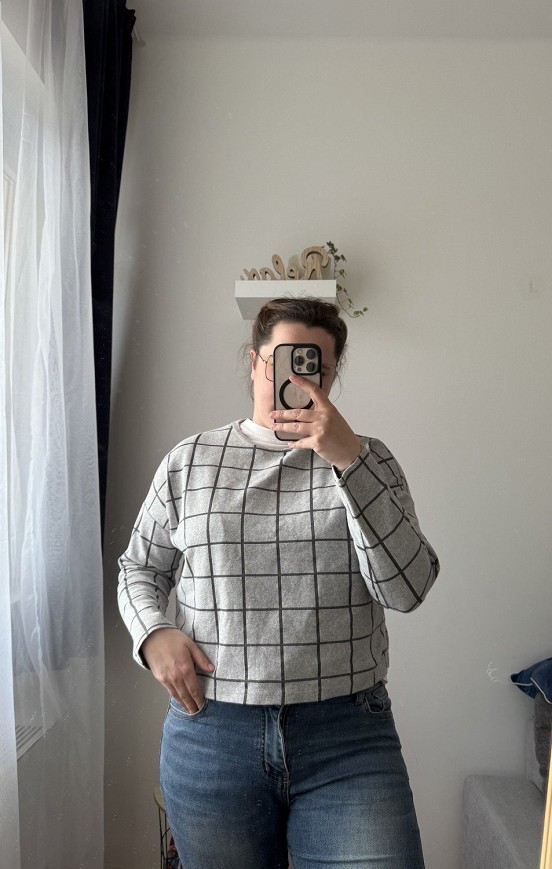 Szürke alapon fekete rácsmintás, hosszú ujjú felső a Primark márkától. Laza, kényelmes fazonú darab, ami könnyen beilleszthető a mindennapi ruhatárba. Farmerrel, leggings-szel vagy akár elegánsabb nadrággal kombinálva is jól mutat — praktikus és stílusos alapdarab.