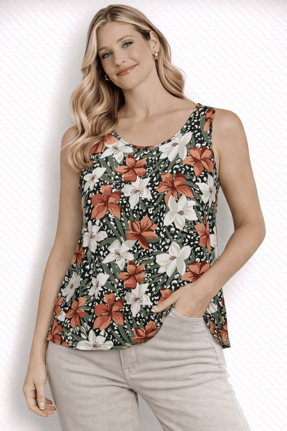 Könnyű, lenge anyagú felső, színes virágmintával. Nyári darab, önmagában vagy blézer alá is jól hordható.