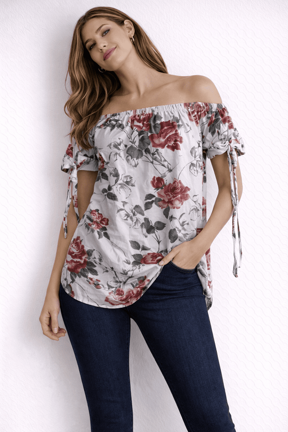Vállra húzható (off shoulder) fazon, gumírozott nyakkal, az ujjakon megkötős részlettel – nagyon csinos kis extra 🎀 Rugalmas anyagú.