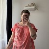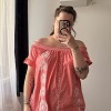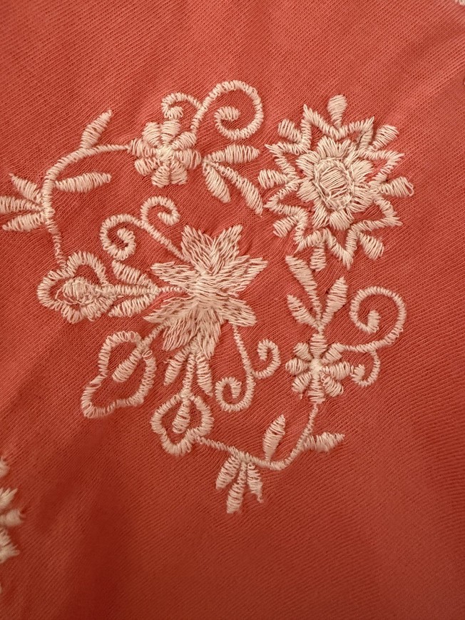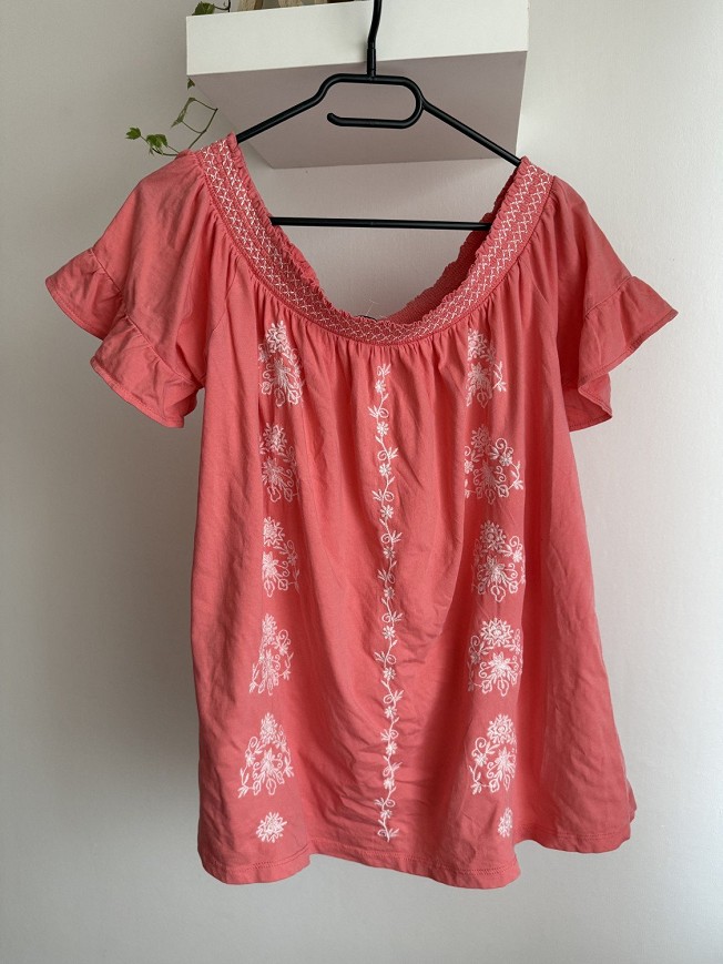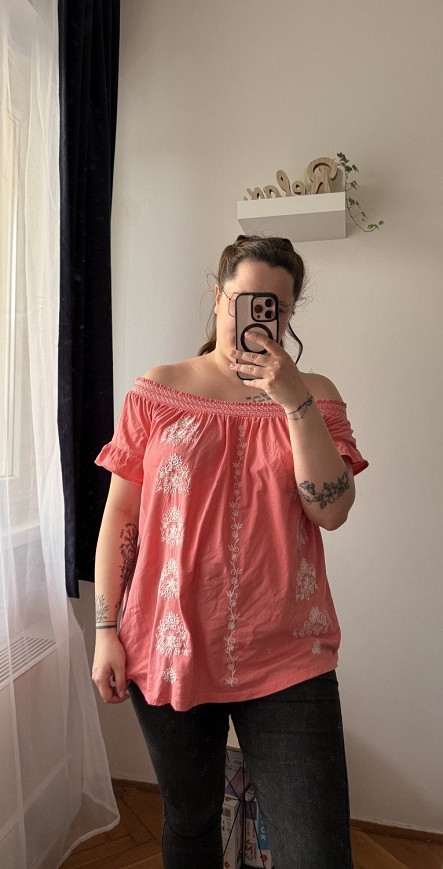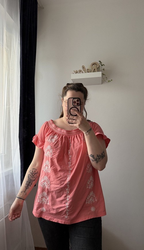 Vidám, hímzett felső romantikus részletekkel és nőies szabással. Könnyed, kényelmes darab a melegebb napokra, szoknyával és farmerrel is csinos választás. A himzéseknél apró lyukak találhatók, ezt az ár is tükrözi.