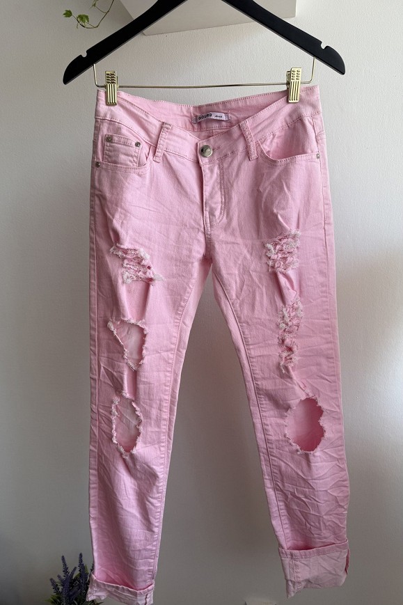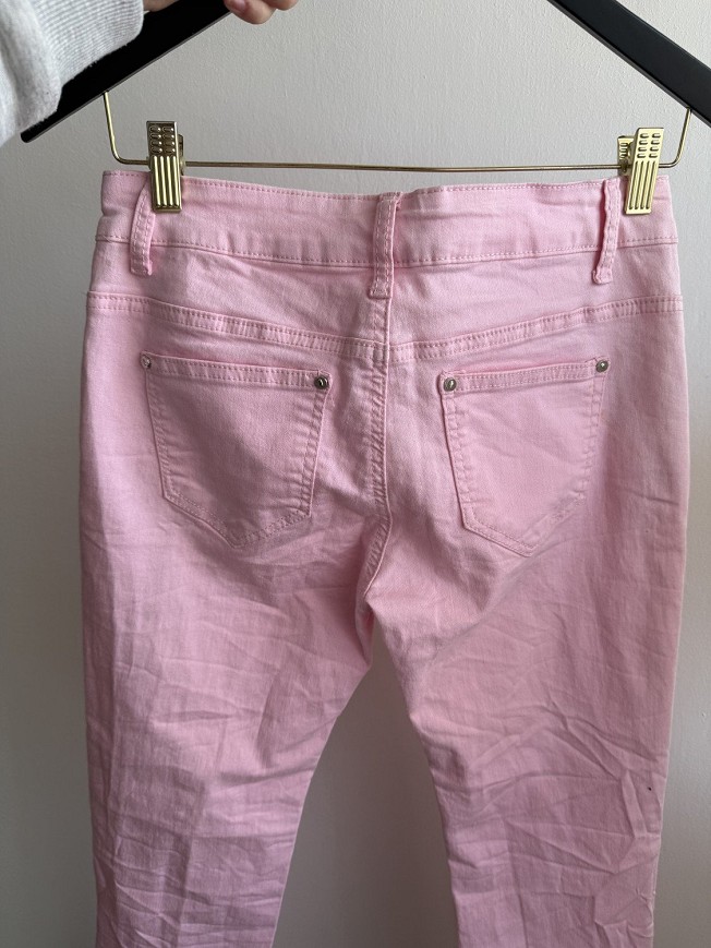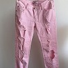 Rózsaszín, szűk fazonú farmernadrág divatos szaggatott részletekkel. Rugalmas, kényelmes anyagból készült, amely jól illeszkedik a testhez. Feltűnő, trendi darab, amely feldobja a hétköznapi szetteket.