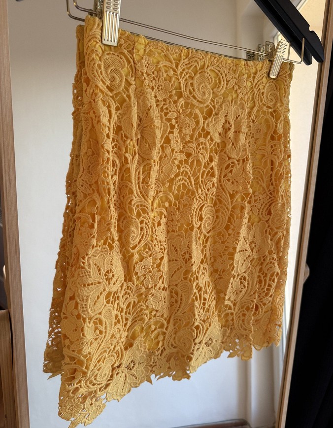 Sárga csipke anyagú szoknya. Nőies, különleges mintázatú darab, ami szépen mutat elegánsabb vagy hétköznapi szettekhez is. Nyári alkalmakra is tökéletes választás. 🌼