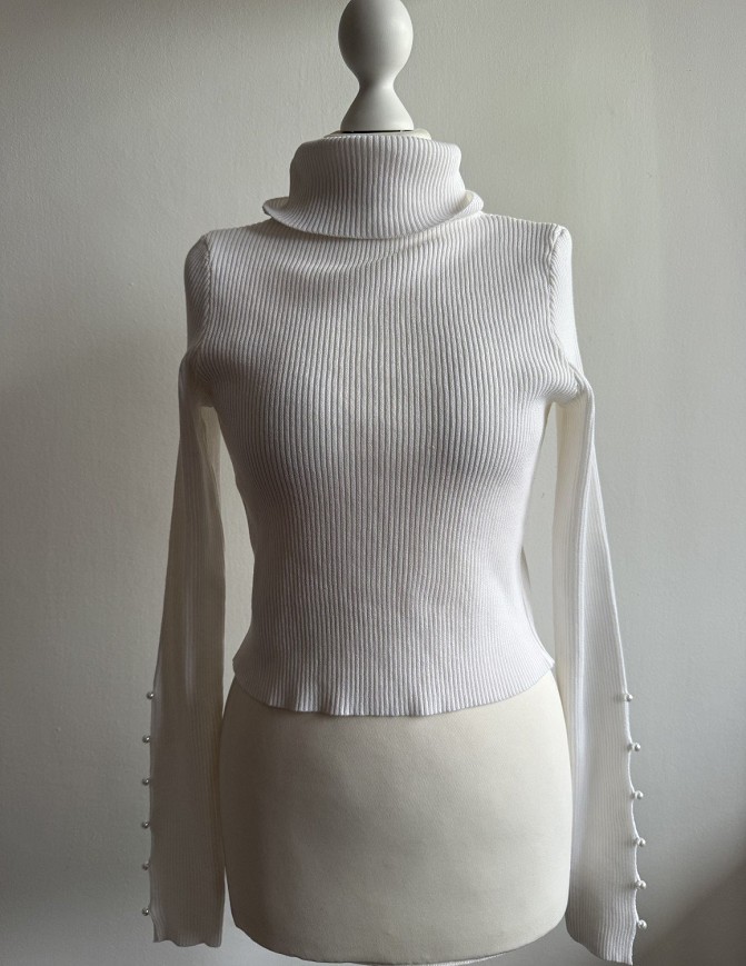 Hosszú ujjú, bordázott anyagú felső magasított nyakkal.