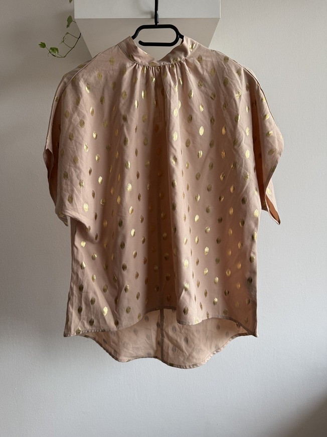 Világos,rózsaszín női felső a Shein-től, diszkrét arany pöttyös mintázattal, ami feldobja az egyszerű fazont. Lazább, kényelmes szabása miatt könnyű és légies viselet, tökéletes választás tavaszi-nyári outfitekhez. Farmerrel, szoknyával vagy akár elegánsabb nadrággal is stílusos szettet alkothatsz belőle.