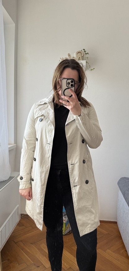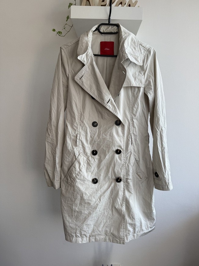 Világos bézs s.Oliver női ballonkabát. Duplasoros gombolású, klasszikus fazon, elegáns gallérral és zsebekkel. Átmeneti időszakra ideális, könnyen kombinálható elegánsabb és hétköznapi szettekkel is.