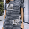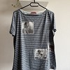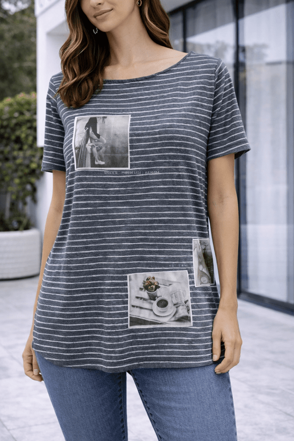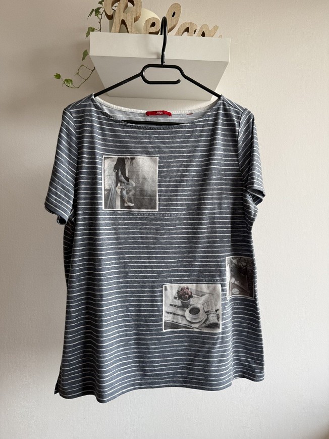 Csíkos mintájú, szürke-fehér női póló az s.Oliver márkától, trendi fotó-rátétekkel az elején. Puha, kényelmes pamutanyagból készült, laza szabású darab, amely tökéletes a mindennapi viselethez. Farmerrel, shorttal vagy szoknyával is könnyen kombinálható, egyedi és stílusos alapdarab a gardróbodba.
