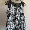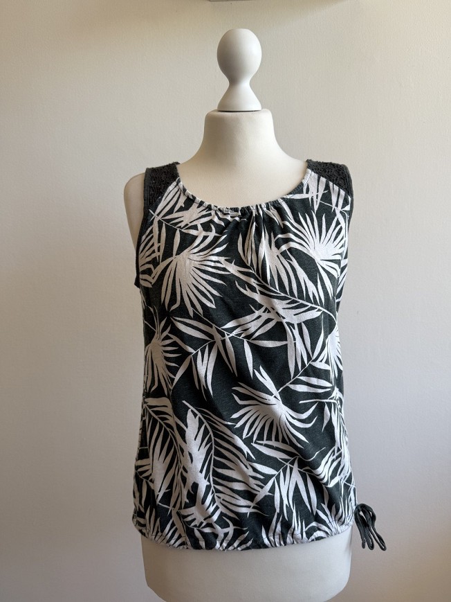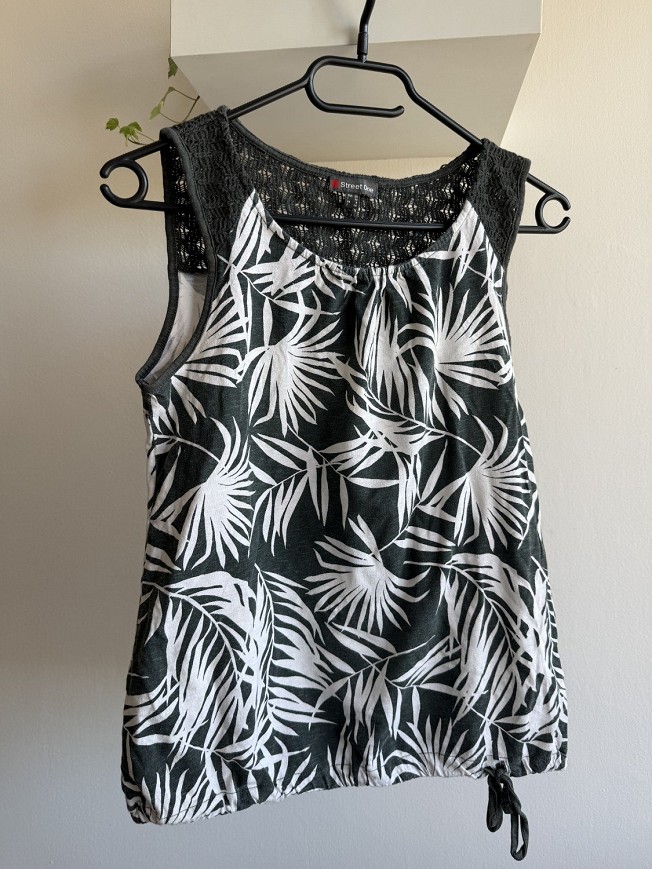 Street One zöld-fehér mintás, ujjatlan női felső. Laza, könnyed esésű darab, amelyet a trópusi levélminta igazán frissé és nyári hangulatúvá tesz. A vállrészen csipkés betéttel készült, ami nőies és különleges részletet ad neki. Az alján megköthető, így formázható és csinosan igazítható. Farmerrel, shorttal vagy szoknyával is remek választás. Használt, szép állapotú, kényelmes és stílusos darab.