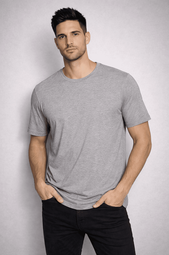 Klasszikus szürke színű, rövid ujjú férfi póló letisztult fazonnal.